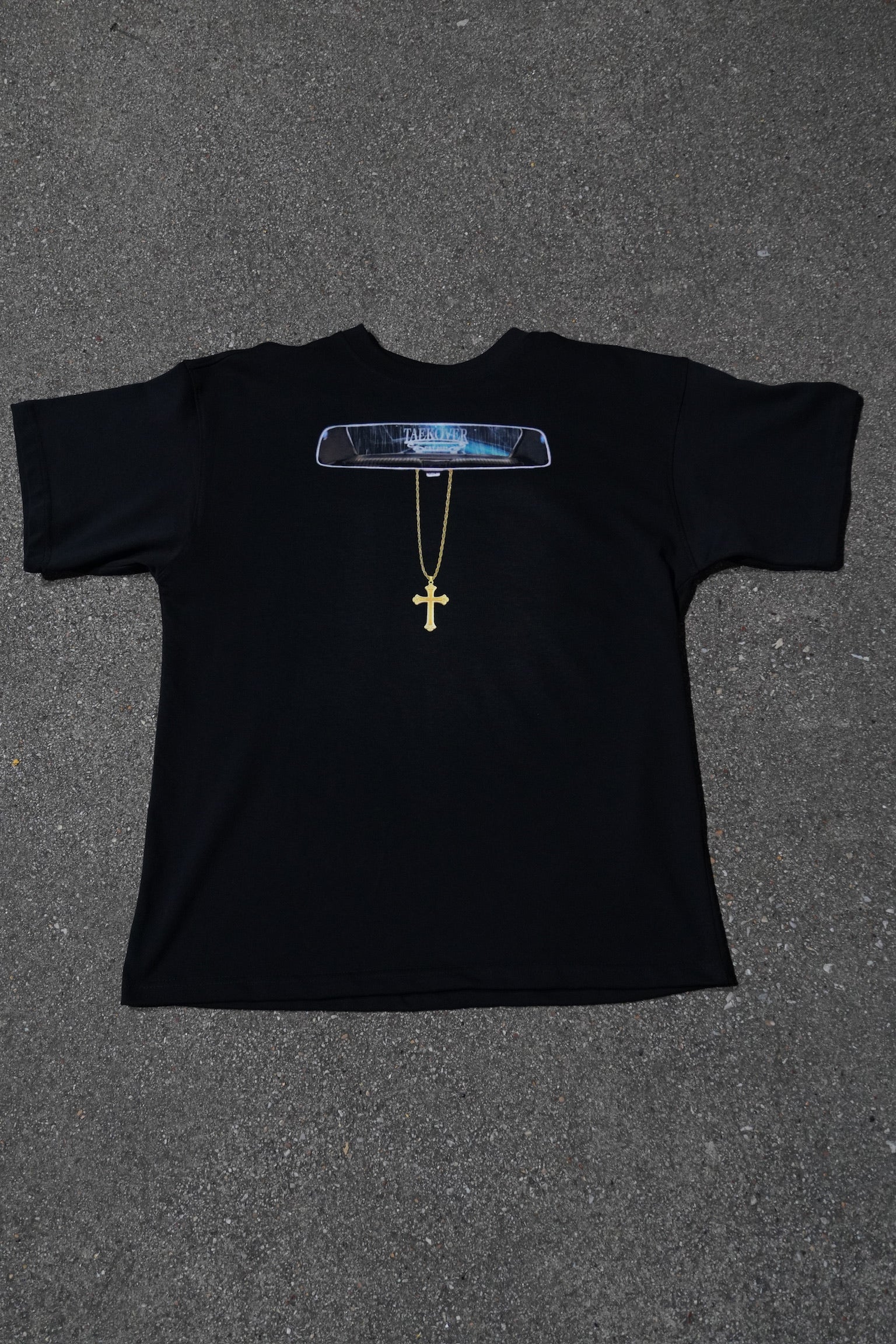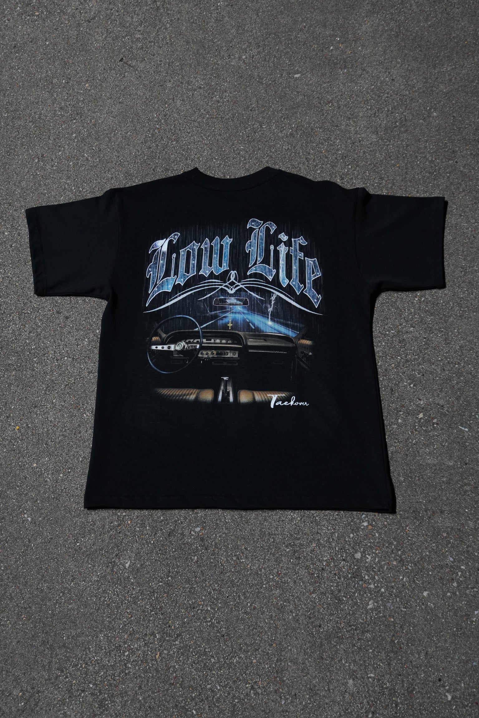 The front features a rear-view mirror with a gold cross necklace hanging on the mirror. The contents of the rear-view mirror is a Lowrider style car plaque with the word "Taekover". The back of this tee is an overview of a lowrider interior down to every detail. The words "Low Life" are arched above the interior graphic.